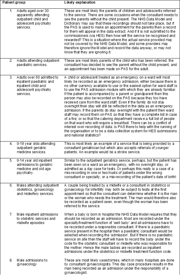 The report also identifies an issue that will be familiar to experienced analysts: the functionality of the organisation’s PAS (Patient Administration System) can sometimes be the determining factor in how the data are recorded. Appendix D explains: